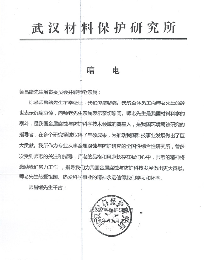 武汉材料保护研究所致唁电
