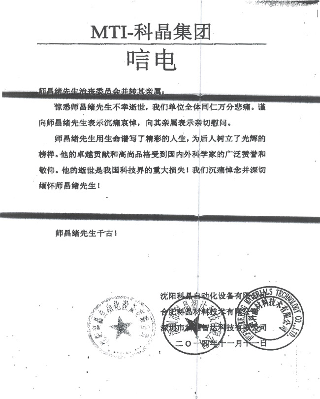 沈阳科晶自动化设备有限公司、合肥科晶材料技术有限公司、深圳市科晶智达科技有限公司致唁电