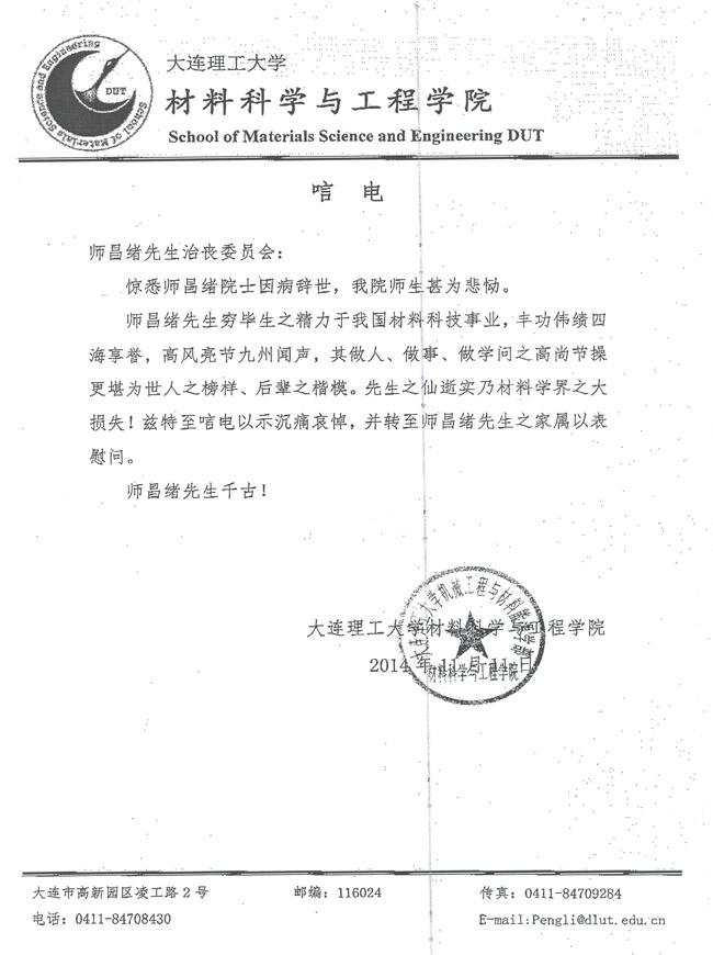 大连理工大学材料科学与工程学院致唁电