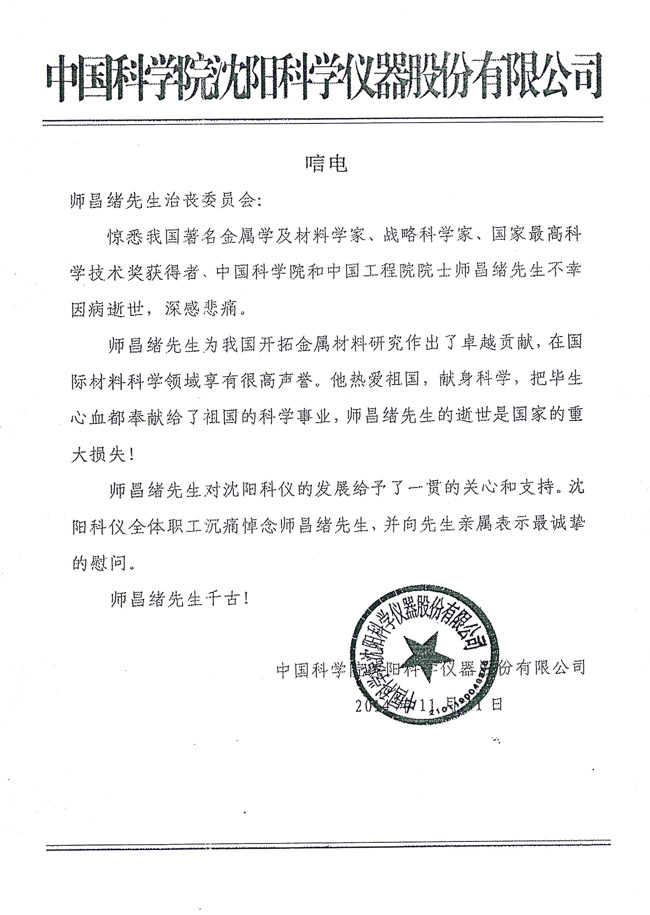 中国科学院沈阳科学仪器股份有限公司致唁电