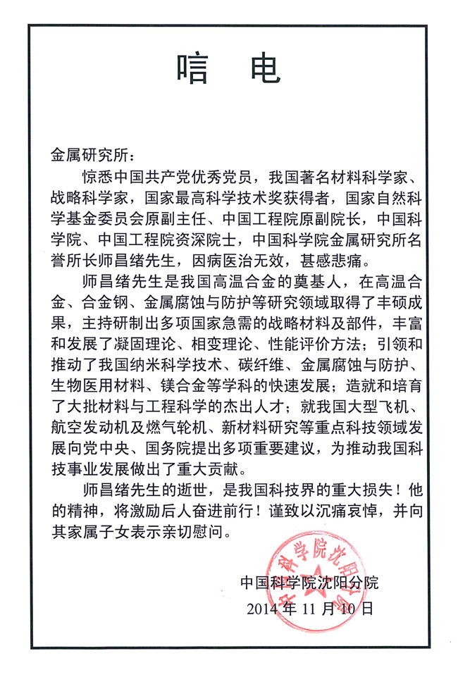 中国科学院沈阳分院致唁电