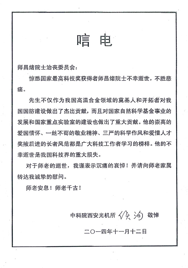 中国科学院西安光机所 侯洵院士致唁电