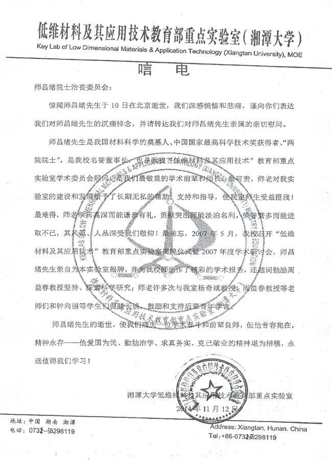 湘潭大学低维材料及其应用技术教育部重点实验室致唁电
