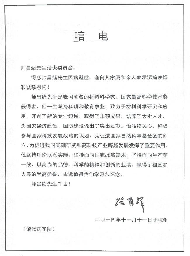 路甬祥致唁电