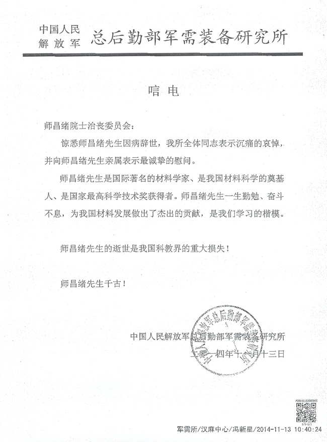 中国人民解放军总后勤部军需装备研究所致唁电