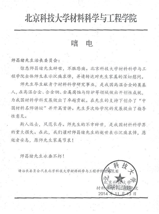 北京科技大学材料科学与工程学院致唁电