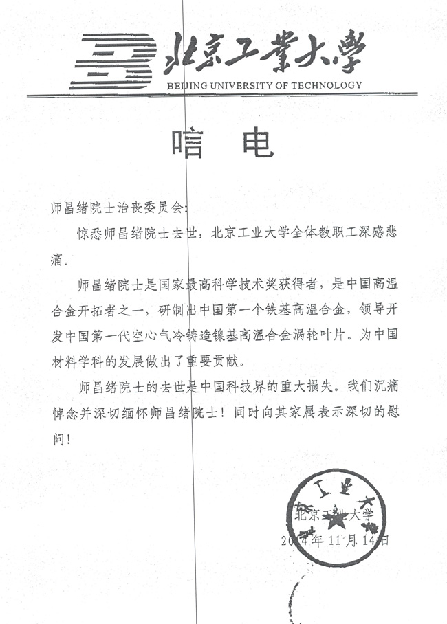 北京工业大学致唁电