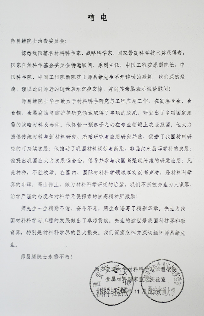 西安交通大学材料科学与工程学院、金属材料国家重点实验室致唁电
