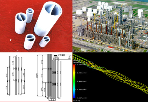 带着这两个问题回到所里向朱老师作了汇报,立刻引起了朱老师极大的兴趣,并很快返回辽化进一步了解装置和工艺流程,发现当时的裂解炉管是由几段3米左右长的离心铸管焊接成11米左右长的裂解炉管,这样几十根甚至上百根不同直径的炉管按一定规律排列在炉内,火焰通过炉管外壁加热管内流动的石脑油或轻柴油,在850℃左右裂解成乙烯等短链产品。物料高速通过炉管,呈平行流动状态,管壁处有边界滞流层,这部分热阻很大。由于热传导和表面张力,物料流速中心快,靠近管壁慢,而温度则是中心比管壁处低,温度高的裂解过度,碳原子聚集结焦;中心温度不够,裂解不充分。找到原因就有可能找到解决的办法,我们很快设计出一种内螺旋的管段,类似与炮筒的膛线,目的是即增加内表面面积增加热交换面积,同时改变物料流动状态,由平流改为湍流。我们用最短的时间研制出这种带有内螺旋的管段,辽化的张总将这一构想向中石化科技部装备处的许适群作了汇报,许工听后为之一动,马上组织北化院和北京工程公司(BPK)相关专家,把我们找到北京一起进行交流,会上专家们对我们的设想褒贬不一,有的专家甚至不屑一顾,也有些专家提出忠恳的建议。第一次见公婆演砸了,但我们没有灰心,回来认真分析专家的批评和建议,并请教流体力学的专家进行流体计算,同时在实验室进行冷态模拟实验,最终完成了现在的扭曲片管的设计。
