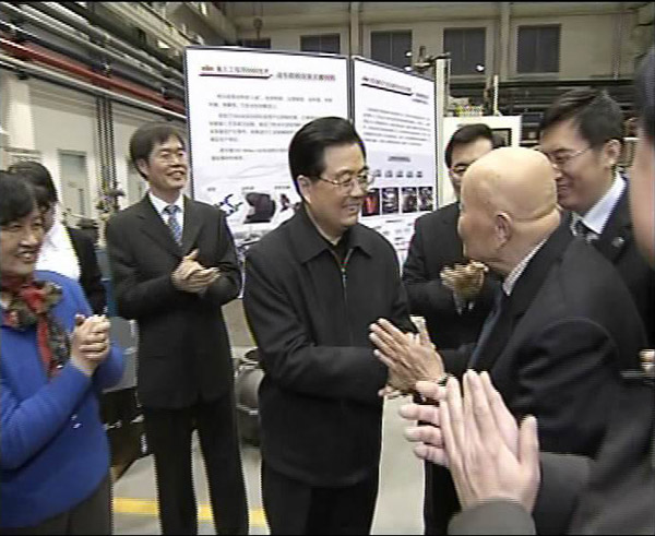 2008年12月13日胡锦涛总书记视察耀彩网,亲切接见师昌绪院士等在所工作的院士