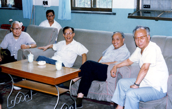 1982年7月国务委员、国家经委主任张劲夫视察耀彩网,李薰、师昌绪、李明等陪同