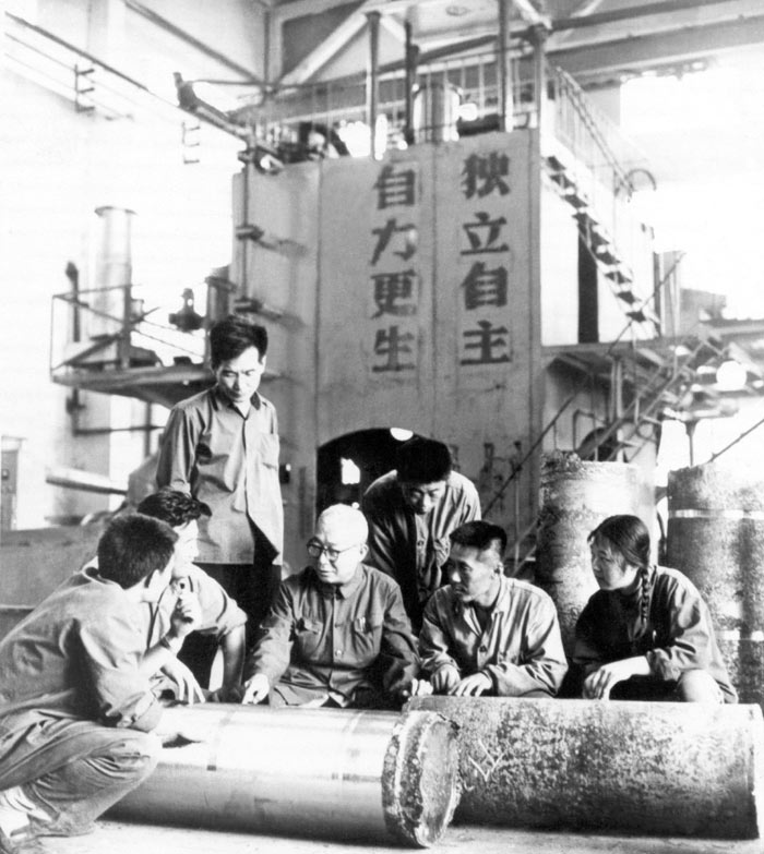李薰同志经常深入到工厂,解决新材料研制和质量问题。这是72年8月在八一四厂。
