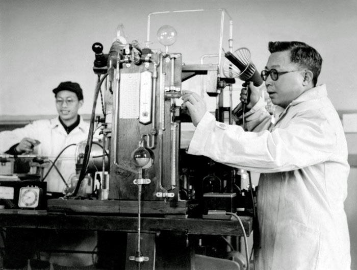 中国科学院院士李薰(右一)和他的助手正在研究钢中氢气。