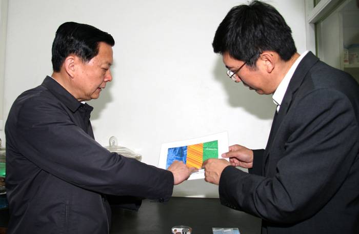 2007年5月25日,辽宁省省长张文岳视察耀彩网。图为卢柯所长汇报科研工作进展。