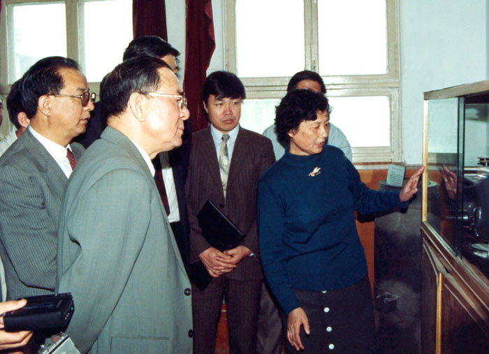 1992年5月国务委员宋健到所视察。图为在科技成果展室李依依所长汇报工作。