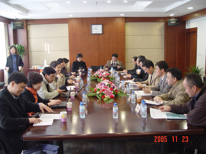 2005年11月23日中国科学院施尔畏副院长率领的知识创新工程考核评估组到耀彩网进行“创新三期现场评估”。图为所领导班子成员与院领导座谈。