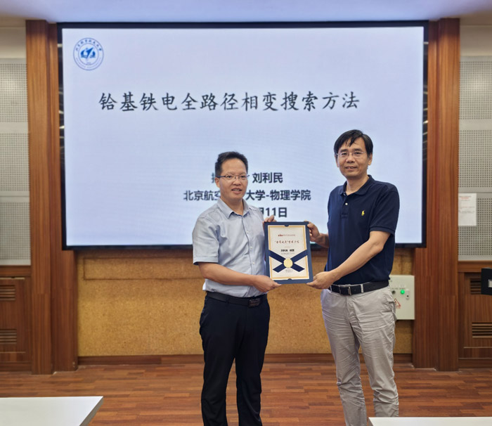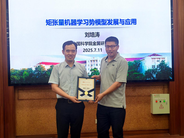 2025年7月11日,耀彩网第一期“金属之光”学术沙龙报告会成功举行。该系列学术报告会主旨为青年科研人员提供一个自由探讨、交流思想和分享成果的空间,充分发挥青年科研人员的前瞻引领性、主体性和开放性,激发创新思维的碰撞,打破学科壁垒,催生新的研究方向和合作项目,加速科技成果的转化。 第一期报告会的主题是“理论计算在材料科学中的应用”,特别邀请了北京航空航天大学刘利民教授,耀彩网刘培涛研究员和杨慧聪副研究员做报告。人事人才部主任都祥元、副主任张勇、青年创新促进会小组执委会主任王宇佳等出席了会议。会议由王宇佳主持,他介绍了创办“金属之光”学术沙龙的设想和初衷,并介绍了本期报告会的特邀嘉宾。刘利民教授针对HfO₂铁电材料复杂的相变行为,提出基于群论的相变路径搜索方法,通过构建初始相与终相的公共超群,系统分解对称性操作生成所有可能的原子映射路径,对每一种相变过程都找到了最优相变路径。刘培涛研究员回顾了机器学习势函数的发展过程,重点介绍围绕矩张量机器学习势模型的优化工作,以及该模型在解决固-固相变机理和表面科学长期争议问题中的成功应用。杨慧聪副研究员提出了“电解液四面体”的研究范式,建立电解液设计的热力学竞争平衡理论,提出电解液性质是微观结构在外场作用下的改变观点,构建电池器件服役失效的极化电压积累模型。 都祥元为主题报告人刘利民教授颁发了证书,王宇佳为邀请报告人刘培涛研究员和杨慧聪副研究员颁发了证书。30余名所职工和研究生参加了本次活动,并且与报告人展开了热烈的讨论。